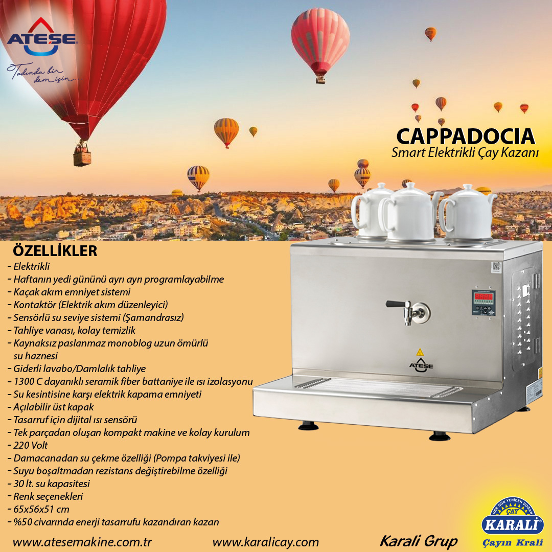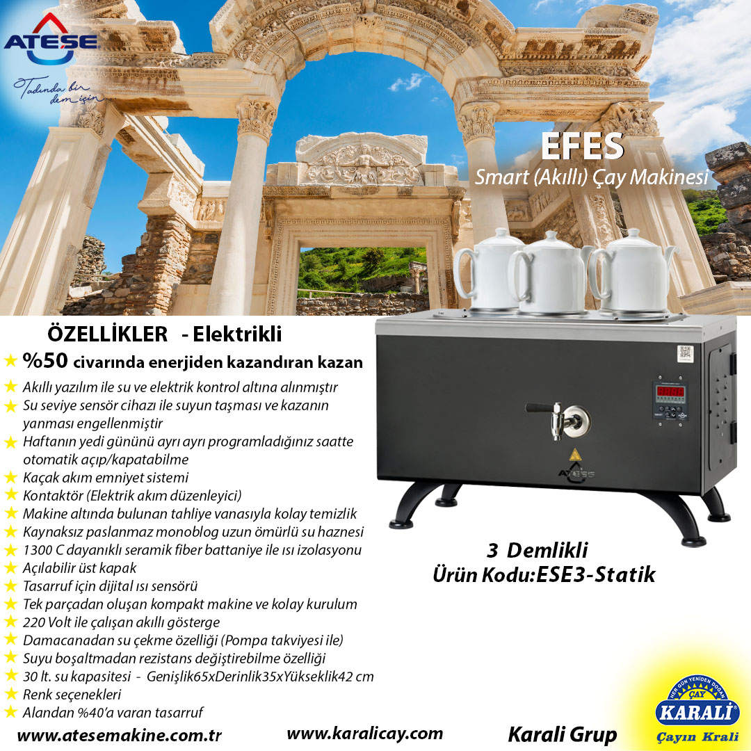 Yüksek Güvenlik Tedbirli, Akıllı Kontrol Panelli, Yakıttan ve Zamandan Kazandıran Kazan... Ateşe Makine, 2002 yılında TÜBİTAK ile Ar-Ge çalışmalarına başlayarak, ürünlerini geliştirip, 2005 yılında seri üretime geçmiştir. TÜBİTAK işbirliği ile yürütülen çalışmalar sonucunda, akıllı yazılımla su, gaz ve elektrik kontrol altına alınmış; çevre dostu, inovatif (yenilikçi) ve yüksek teknolojili kaliteli malzemeler kullanılarak iş güvenliği en üst seviyeye taşınmıştır. Ayrıca, şamandıra sistemi kaldırılarak akıllı yazılım (sensör sistemi) ile su kullanımı kontrol altına alınmıştır. Ülkemize, şirketlere ve son kullanıcılara enerjiden %40 ila %50 oranında tasarruf sağlayarak kazandıran bir kazan hâline getirilmiştir. 20 yılı aşkın süredir yapılan yeniliklerle dört nesil ürün geliştirilerek, tasarım ve yazılım sistemlerindeki farklılıklar net bir şekilde ortaya konmuştur. Yılların kazandırdığı deneyimle yeni nesil makinelerimiz; çaya değer katan, 7/24 programlanabilen, ergonomik ve çevre dostu özellikleriyle ön plandadır. Yeni nesil çay makinelerinin yanı sıra bardak ısıtıcıları, su ısıtıcıları ve kumda kahve makineleri de ürün yelpazemize eklenmiştir. Mimari dekorasyon tercihlerine uygun şekilde işletmelerin görsellik kaygılarını gidermektedir. Hizmetin müşteri önünde yapıldığı alanlarda fabrikalar, kamu kurumları, oteller, restoranlar, pastaneler, brasserieler, kafeler, barlar ve çay evleri daha çok tercih edilir hâle gelmiştir. Su Sıcaklığı ve Çay Demleme Su sıcaklığı, demlenen çayın tadını, özütünü ve diğer taşıdığı habitat özelliklerini salmasına yardımcı olur. İstenilen sıcaklığa ulaşmayan çay, aromasını, tadını ve lezzetini sunamaz. Smartplus, Smart ve Digital kontrol yazılım sistemleriyle çay demleme ile ilgili önemli parametreleri dikkate alarak; su sıcaklığı ve demleme süresi gibi temel unsurları en iyi şekilde yönetmektedir. Akıllı Su Kontrol Sistemi Akıllı su kontrol sistemiyle makinelerimiz, şebeke suyu ile veya pompa yardımıyla damacana suyu ile çalışmaktadır. Su kesildiğinde veya damacana suyu bittiğinde, sistem bunu algılar; enerjiyi keser, makineyi çalıştırmaz ve koruma moduna geçer. Böylece iş güvenliği en üst seviyeye çıkartılmış olur. Çevre Dostu ve Güvenli Makineler Makinelerimiz; çevre dostu, hijyen standartlarına ve Avrupa Birliği normlarına uygun, iş güvenliğini ve insan sağlığını önceliklendiren CE sertifikasına sahiptir. 1300°C sıcaklığa dayanıklı porselen yün battaniye ile izolasyon sağlanarak ısı kaybı önlenmiş ve enerji tasarrufuna katkı sağlanmıştır. Elektriği regüle eden kondüktör ile kaçak akım rölesi bulunmaktadır. Tüm bu donanım ve işletim sistemleri sayesinde makinelerimiz, piyasadaki diğer ürünlerden farklı olarak zamandan ve yakıttan %40 ila %50 oranında daha az enerji tüketmektedir. Ergonomik ve Yenilikçi Tasarım Makinelerimiz, yeni ergonomik formu ve kaynaksız monoblok su haznesi ile sektörde ilk ve tektir. Bu hazne, daha uzun ömürlü, sorunsuz ve bakımı kolaydır. Temizlik sırasında vana ile gidere bağl