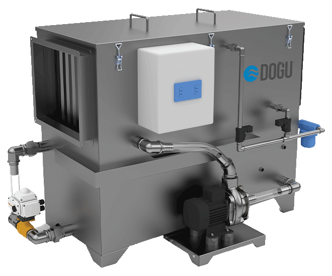 SMOKE Duman Yıkama Cihazı, kömürlü ızgara ve odun ateşinde pişirme yapılan mutfaklarda yoğun duman ve partikül çıkışını kontrol altına almak için özel olarak geliştirilmiştir. Açıklama Malzeme ve Kullanım Özellikleri SMOKE Duman Yıkama Cihazı, davlumbazdan gelen duman içindeki kurum ve is gibi partikülleri tutarak, hava ile taşınan alev ve kıvılcımı etkili bir şekilde yok eder. Cihaza siyah renkte giren hava, yıkama işlemi sonrasında daha açık bir renkte dışarı atılmasını sağlar. Egzoz havasının basınçlı suyla yıkanması prensibine dayanan SMOKE, 3.000-10.000 m³/h debi aralığında üretilmektedir. Kullanıldığı sistemlerde arkasındaki filtrelerin ömrünü uzatır ve yangın ile arıza riskini en aza indirir. Cihaz, sirkülasyon pompası ile içerisindeki suyu kullanarak sürekli şebekeden su çekmez. Su seviyesi düştüğünde, üzerindeki selenoid vanalar sayesinde otomatik su takviyesi yapılır. Filtreleme Aşamaları SMOKE cihazında üç farklı filtre aşaması bulunmaktadır: Ön Filtre: İlk aşamada, büyük partiküller tutulur. Yağ Tutucu Filtre: Yıkama sırasında çökelmeyen yağ ve benzeri partiküller burada tutulur. Damla Tutucu Filtre: Yıkama sonrasında hava akışında kalan nem, bu filtrede tutulur. Bu sistem, cihazın verimliliğini artırarak filtrelerin ömrünü uzatır. Otomasyon Kontrol İmkânı SMOKE, otomasyon sistemleri ile kontrol edilebilen bir cihazdır. Ayrıca, Doğu İklimlendirme San. ve Tic. A.Ş nin mutfak havalandırması için geliştirdiği KITCHEN ürünü ile entegre bir sistemle çalışarak mahal için komple bir havalandırma çözümü sunar. Özellikleri Uzun ömür Kömür ve odun ateşi ile pişirme için ekonomik çözüm Düşük su sarfiyatı Tamamen paslanmaz tasarım Otomasyon ile kontrol imkânı Gövde sacları talebe göre AISI 304 veya AISI316 kalite paslanmaz sac Paslanmaz çelik çarklı santrifüj pompa, Jet nozullar ve diğer tüm elemanlar paslanmaz çelikten üretilir.