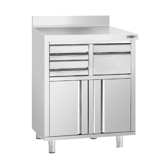 Tasarım Kahve makineleri için ideal Yüksekliği ayarlanabilir paslanmaz çelik ayaklar Ayarlanabilir yükseklik maks.200 mm 2 kanatlı kapılı 2 Çekmece Çekme kulplu çekmece ve huniler Telve kovası Yuvarlatılmış kenarlar Kolay temizlenebilir Kalite Yüksek kaliteli AISI 430 paslanmaz çelikten yapılmış gövde Çalışma yüzeyi Sırtlı çalışma yüzeyi Boyutlar Dış boyutlar G x D x Y: 800 mm x 600 mm x 1.150 mm Notlar Sökülebilir paslanmaz çelik ayaklar teslimata dahildir! Yönergeler Hijyen ve güvenlik kurallarına uygun olarak üretilmiştir. CE standartlarına uygun üretilmiştir Malzeme Avrupa gıda standartlarına uygundur