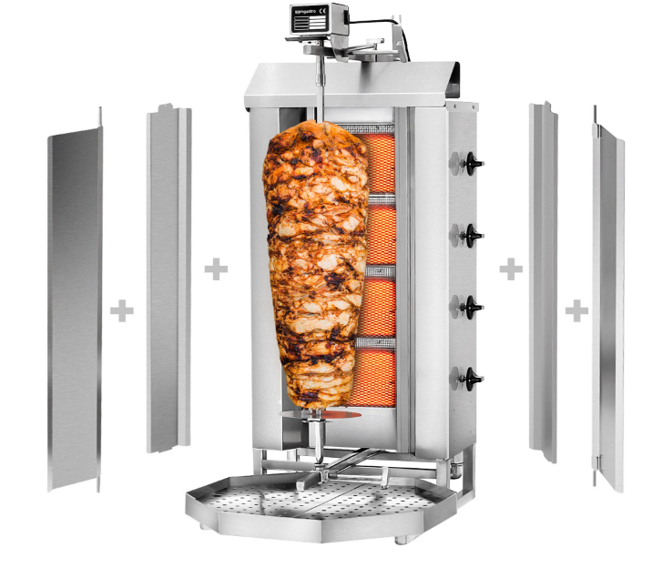 Ürün Avantajları Hızla sökülebilir çamurluk sayesinde basit temizlik Çamurluk bulaşık makinesinde yıkanabilir Tasarım Alevi izleyen ve alev söndüğünde cihaza giden gaz beslemesini otomatik olarak kapatan emniyet termokupllu Üstten motorlu Kapasite: max. 60 kg 4 brülör Yüksek performanslı brülörler Brülöre göre ayarlanabilir döner şişi Et şişi kalınlığı: 12mm Emniyet valfi Kalite Yüksek kalite paslanmaz çelik Bağlantı Güç: 13 kW Propan ve doğal gaz için uygun Gerekli gaz basıncı maks. 20 mbar Boyutlar Dış boyut: G x D x Y: 550 mm x 700 mm x 1.120 mm Teslimat kapsamı 2 kanatlı kapılı 1 Et şişi 2 çamurluklar Doğal gaz ve propan gazı memeleri ile teslimat Yağ toplama haznesi Notlar Mümkün olan en iyi performansı ve ürünün optimum kullanımını sağlamak için bir atık hava sisteminin kullanılmasının tavsiye edildiğini belirtmek isteriz. Yönergeler Hijyen ve güvenlik kurallarına uygun olarak üretilmiştir. CE standartlarına uygun üretilmiştir Malzeme Avrupa gıda standartlarına uygundur