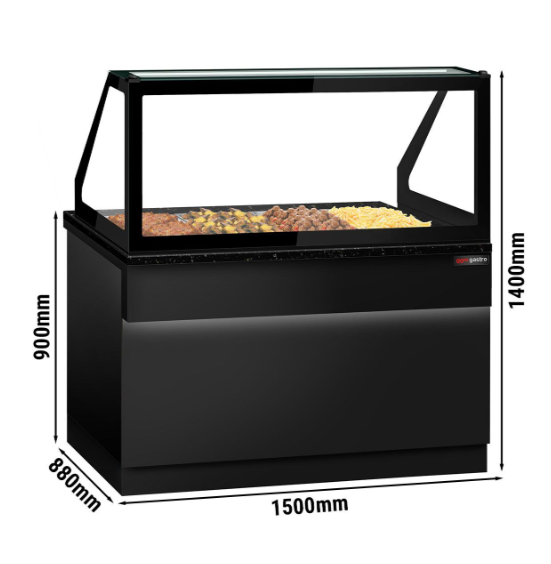 Ürün avantajları Sağlam ön kısım, özelleştirilmiş ön paneller takma seçeneği sunar Tasarım Yüksek kaliteli sıcak tutma tezgahı Ürün rengi: Siyah Mat 4x GN 1/1 Konteyner (mümkün) LED aydınlatma Açma / Kapama düğmesi Sıcaklık kontrolü için termostat Dışbükey cam paneller Su tahliye vanası Kalite Yüksek kalite Paslanmaz çelik Yüksek kalite granit plaka Paslanmaz çelik evye Bağlantı Güç: 3,50 kW Elektrik bağlantısı: 1N/PE / 220 - 240 Volt / 50 Hz - 60 Hz Ortalama güç (kW / 24 sa): 3,50 kW Boyutlar Dış boyut: G x D x Y: 1.500 mm x 900 mm x 1.400 mm Teslimat kapsamı GN küvetler teslimat kapsamına dahil değildir Yönergeler Hijyen ve güvenlik kurallarına uygun olarak üretilmiştir. CE standartlarına uygun üretilmiştir Malzeme Avrupa gıda standartlarına uygundur