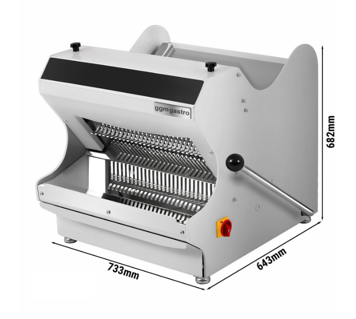 Ürün avantajları Basınç sistemi ekmeğin boyutuna uyum sağlayarak kırılmasını veya ezilmesini önler Kesme işleminin sonunda makine otomatik olarak kapanır Tasarım Ekmek kesme makinesi Setüstü Bıçak sayısı: 30 adet Dilim kalınlığı: 13 mm Saat başına en fazla 500 ekmek dilimi Acil durdurma şalteri Kalite Paslanmaz çelik bıçaklar Bağlantı Güç: 370 Watt Elektrik bağlantısı: 220V / 1N/PE / 50 Hz Boyutlar Dış boyutlar G x D x Y: 733 mm x 643 mm x 682 mm Yönergeler Hijyen ve güvenlik kurallarına uygun olarak üretilmiştir. CE standartlarına uygun üretilmiştir Malzeme Avrupa gıda standartlarına uygundur Notlar Kol sadece ekmeği yerleştirmek için kullanılabilir. Kesme işlemi otomatik olarak gerçekleşir.