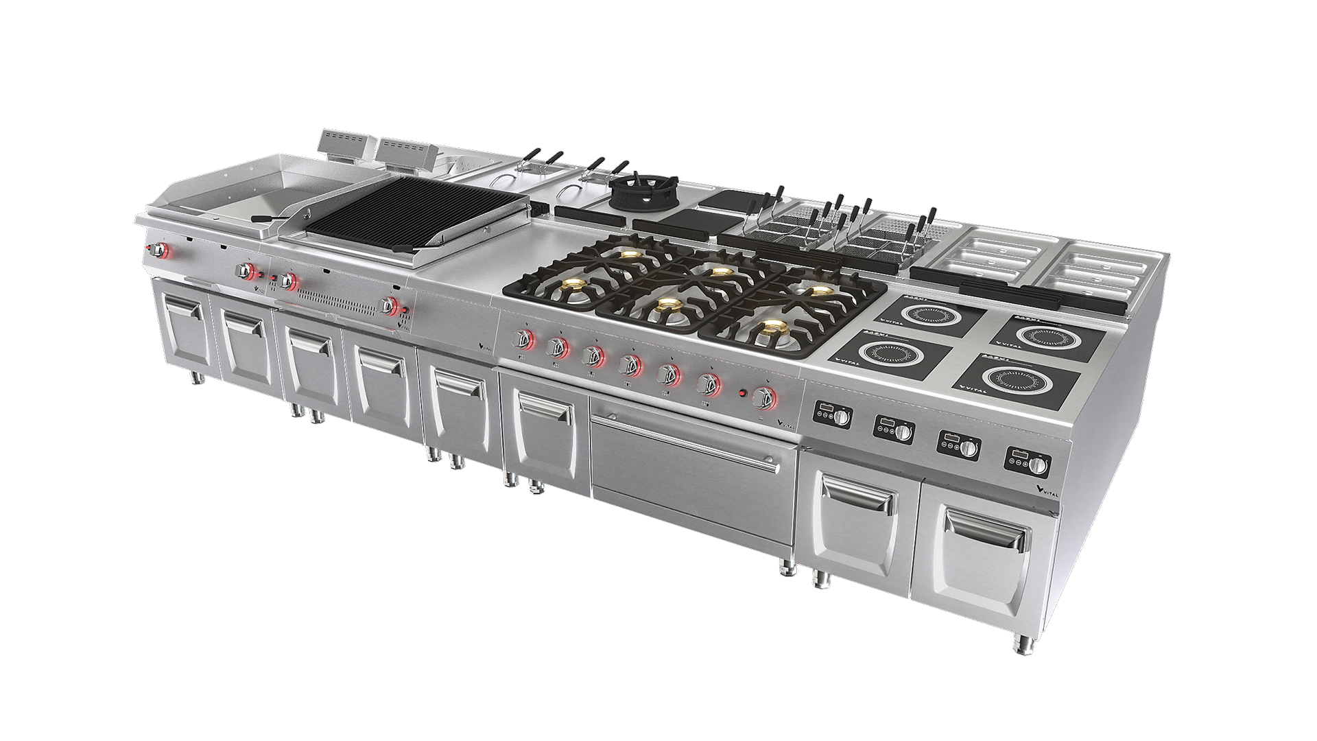 Vital pişirme cihazları profesyonel şefler düşünülerek tasarlanmıştır ve mutfağınıza sağlam güç ve hassas sıcaklık kontrolü getirir. İster hareketli bir restoranı donatıyor olun, ister evinizdeki mutfak alanını yeniliyor olun, Vital serisi güvenilir ve verimli bir çözüm sunar. Kompakt tezgah üstü modellerden tam boy zemin ünitelerine kadar bu cihazlar çeşitli pişirme ihtiyaçlarını karşılar. Ağır hizmet tipi paslanmaz çelik konstrüksiyon, kullanıcı dostu arayüzler ve hızlı ön ısıtma ve eşit ısı dağılımı gibi özellikler. Uzun ömürlü performans için Vital i seçin.