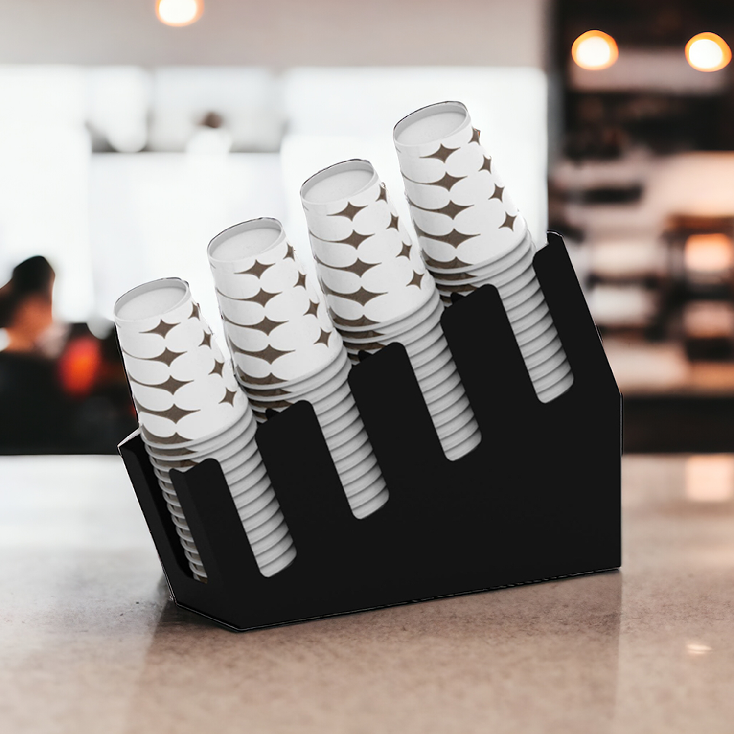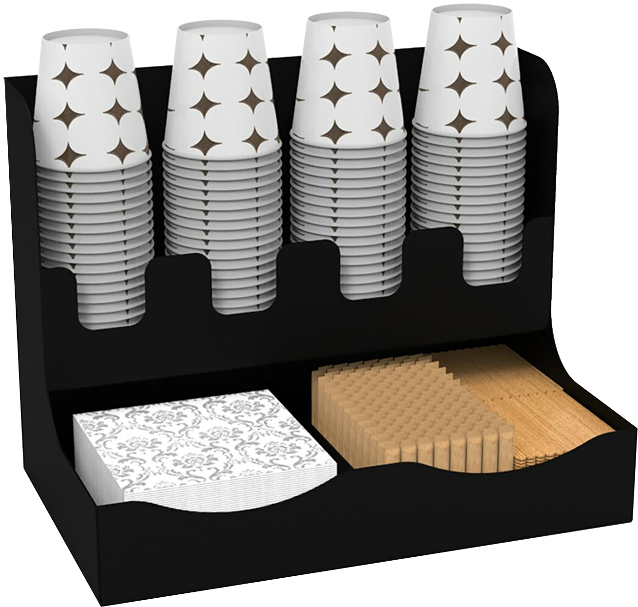 Kafe, restaurant, otel ve barlarınızı yeni nesil kahvecilerin zarif dokunuşlarıyla buluşturan bu şık karton bardak standı, işletmenize değer katıyor. Yüksek kalite metal malzeme kullanılarak tasarlanmış olan bu ürün, dayanıklılığı ve estetik çizgisiyle öne çıkıyor. Pratik ve kullanışlı 4 bölmesi sayesinde, farklı ölçülerdeki karton bardaklarınızı kademeli olarak düzenleyebilirsiniz. 16 oz bardaklarla tam uyumlu karton bardak standı, HORECA sektörüne özel olarak tasarlanmıştır ve işletmenize modern bir dokunuş katacaktır.